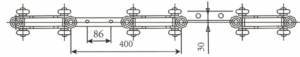 The figure below shows the conveyor chain of XF series conveyor. Each section (T) of the chain has 4 runners, 4 guides and 2 cross links. The travelling wheels and guide wheels are connected with double chain plates through cross joints and pins. The workpiece can be transported by hanging a detachable or fixed lifting plate in the middle of the pin. Its walking wheel and guide wheel are double rows of ball structure, the size of the conventional 38, 45 bearings for guiding, walking wheel composition, track width to make corresponding adjustments.